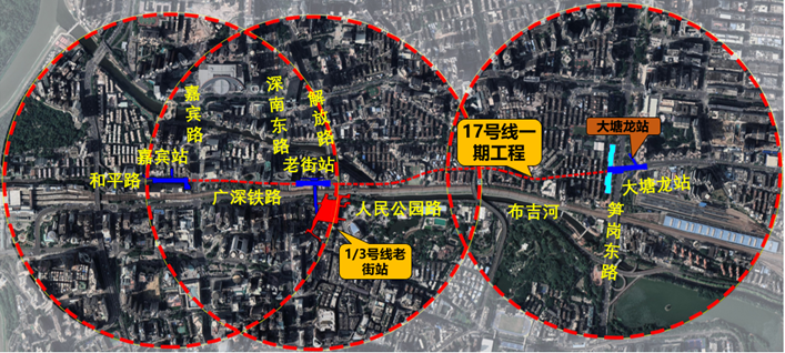 深圳市城市軌道交通17號(hào)線一期工程起始于羅湖西站,止于上李朗站,線路總長(zhǎng)約18.6公里,設(shè)車站18座,全線采用地下敷設(shè)方式,平均站間距 1.1km。嘉賓站位于嘉賓路與和平路交叉口以南,沿和平路南北向敷設(shè),線路出嘉賓站后沿和平路到達(dá)老街站;老街站位于和平路與深南東路交叉口以北,沿著和平路南北向敷設(shè),老街站與1、3號(hào)線換乘;線路出老街站沿廣深鐵路方向并行向北,途經(jīng)桂木坊、深圳紅桂中學(xué)、百草園幼兒園、口腔醫(yī)院、深圳市木材公司、萬科桂苑、大塘龍小區(qū)等區(qū)域后,在筍崗東路下方設(shè)大塘龍站。(詳見附圖)
