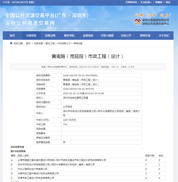 2022年2月22日,經(jīng)深圳市公共資源交易中心中標(biāo)公示通過,深圳市政院與同濟(jì)大學(xué)建筑設(shè)計(jì)研究院(集團(tuán))有限公司(聯(lián)合體)在深圳市龍崗區(qū)建筑工務(wù)署黃閣路(南延段)市政工程(設(shè)計(jì))項(xiàng)目公開招標(biāo)中成功中標(biāo),中標(biāo)金額為1867.55萬元。
