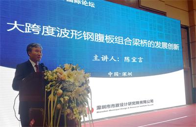 陳宜言董事長在大會上做了題為《大跨度波形鋼腹板組合梁橋的發(fā)展創(chuàng)新》的主題演講。他首先介紹了中國橋梁建設(shè)已由橋梁大國向強(qiáng)國發(fā)展中所取得的成就,梳理了中國橋梁發(fā)展的脈絡(luò),還介紹了大跨度波形鋼腹板組合橋這一新型組合橋梁的特點和發(fā)展歷史,并詳細(xì)介紹我司對該類橋梁的設(shè)計和創(chuàng)新工作。他還指出,深圳市東寶河新安特大橋的結(jié)構(gòu)創(chuàng)新設(shè)計,證明了我國大跨度波形鋼腹板組合箱梁橋的跨徑已經(jīng)取得巨大突破,當(dāng)前的設(shè)計和施工技術(shù)水平可以使該橋梁的主跨達(dá)到200m。伊朗德黑蘭北部高速BR-06特大橋的成功合龍,體現(xiàn)了大跨度波形鋼腹板組合箱梁橋在強(qiáng)地震烈度地區(qū)的推廣和使用價值。而在建中的合肥市南淝河特大橋,進(jìn)一步說明了波形鋼腹板組合箱梁橋可以滿足超寬城市橋梁的設(shè)計要求。該橋也是我國首次將耐候鋼大規(guī)模使用到大跨度波形鋼腹板組合箱梁橋上,為我國鋼混組合結(jié)構(gòu)橋梁的防腐和養(yǎng)護(hù)提出了新的解決方案。他認(rèn)為“中國制造2025”概念的提出,為我國由橋梁大國轉(zhuǎn)變成橋梁強(qiáng)國帶來了最佳契機(jī)。雖然我國橋梁工程設(shè)計、施工和科研方面都取得了一定成果,但仍需要持續(xù)提升我國橋梁建設(shè)創(chuàng)新能力和技術(shù)競爭力,尤其在結(jié)構(gòu)分析和設(shè)計軟件國產(chǎn)化方面需下大力氣。大跨度波形鋼腹板組合梁橋,比起預(yù)應(yīng)力混凝土梁橋具有顯著的社會和經(jīng)濟(jì)效益,將在建設(shè)橋梁強(qiáng)國的過程中發(fā)揮重要作用。近十年來陳宜言董事長對推動我國大跨度波形鋼腹板組合箱梁發(fā)展所做出的貢獻(xiàn),得到了與會專家學(xué)者的贊賞,他對中國橋梁工程發(fā)展創(chuàng)新的觀點也得到大家認(rèn)同。